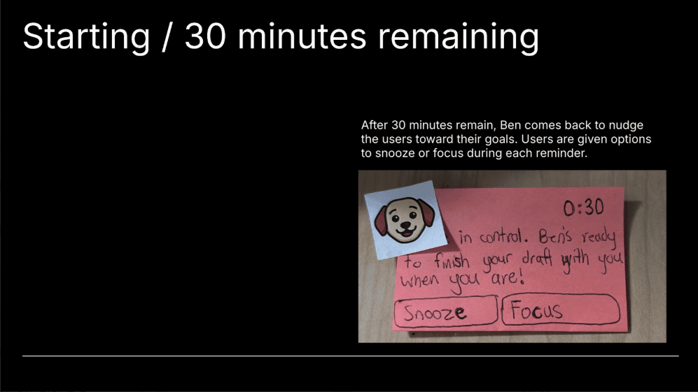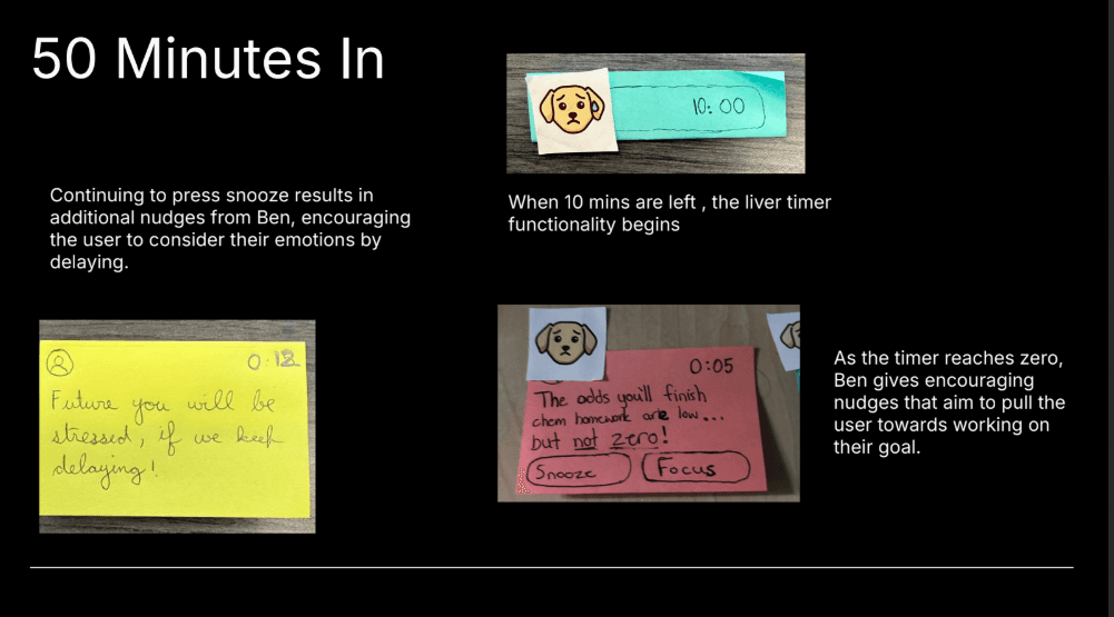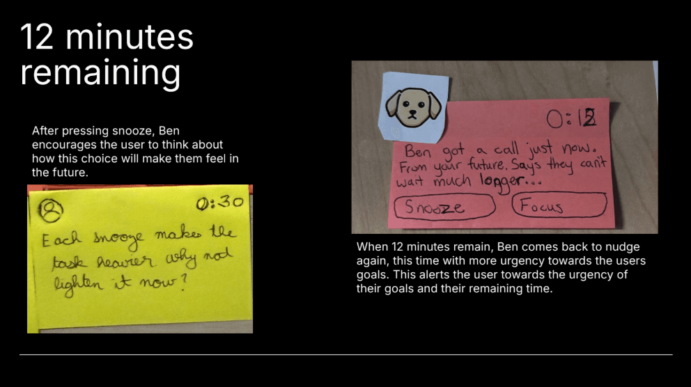 We created low-fidelity paper prototypes simulating phone notifications and timers to test interaction timing, messaging tone, and decision points. These prototypes allowed quick iteration before investing in higher fidelity builds.